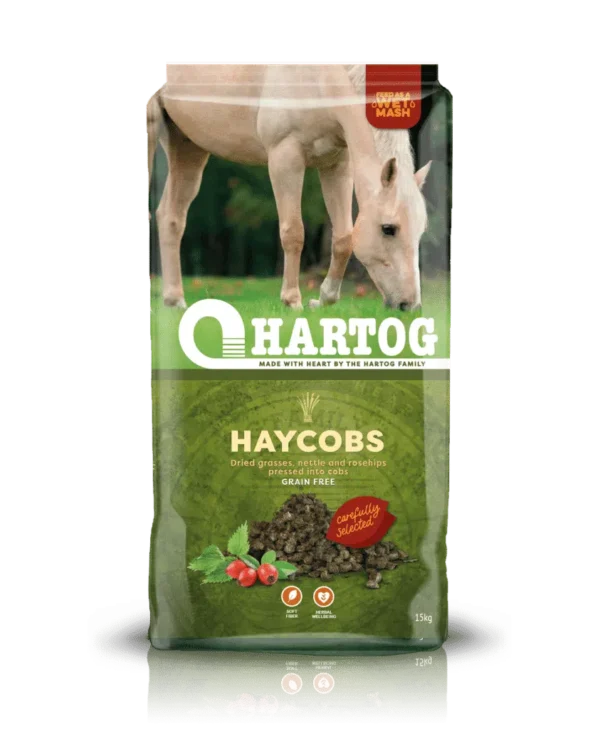 De Hartog Haycobs is een ruwvoer slobber met kruiden die speciaal zijn ontwikkeld om te weken. Dit maakt het zeer gemakkelijk opneembaar en ideaal om te mengen met je balancer en/of supplementen. De cobs zijn brokken die bestaan uit hooi, gedroogd gras, gerstestro, lijnzaad, rozenbottels en brandnetels. Rozenbottels en brandnetels zijn rijk aan voedingsstoffen en een gezonde aanvulling op het rantsoen van paarden.